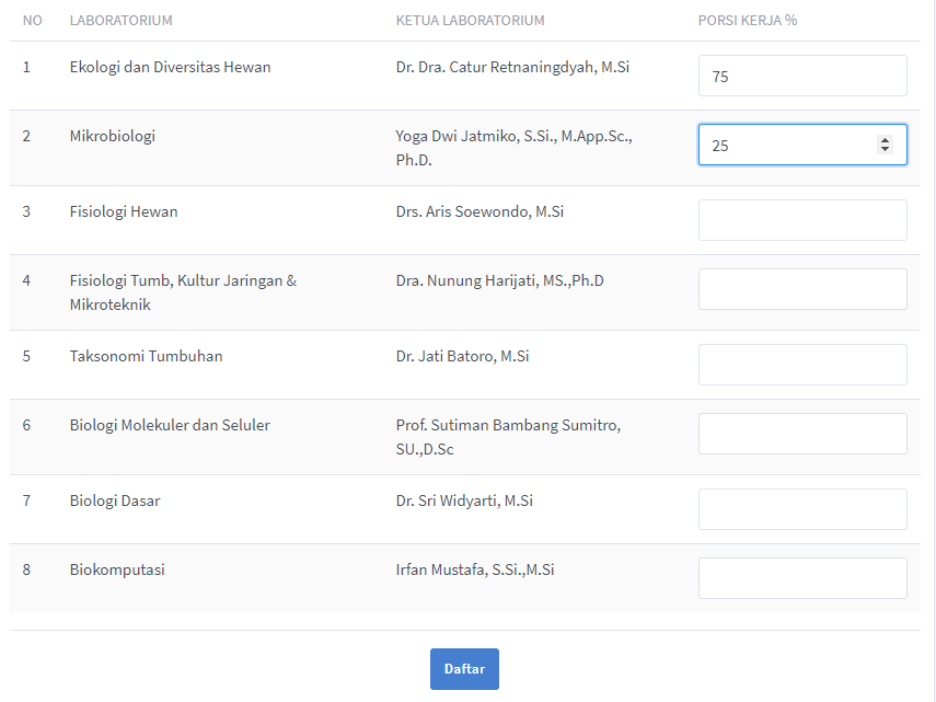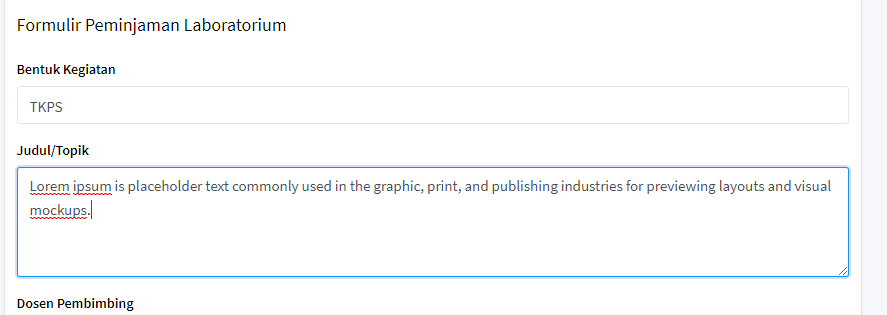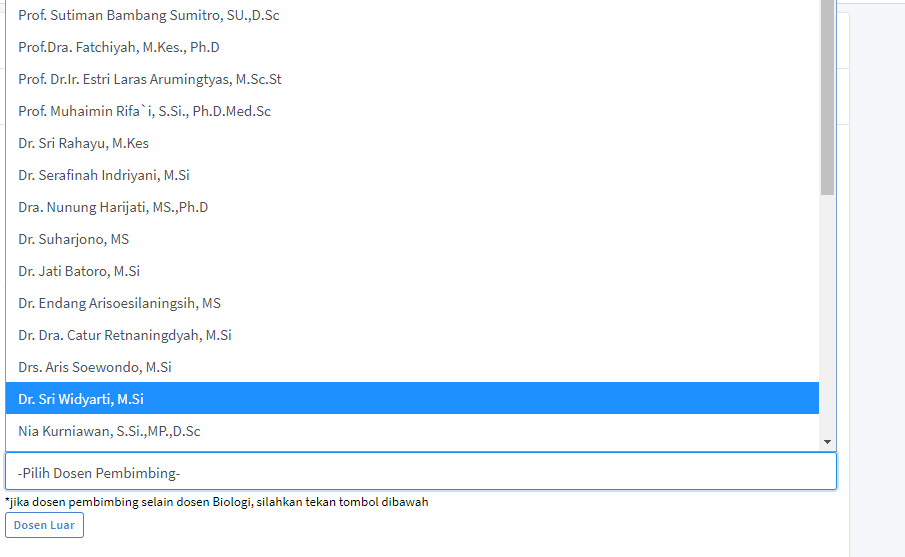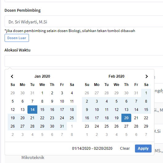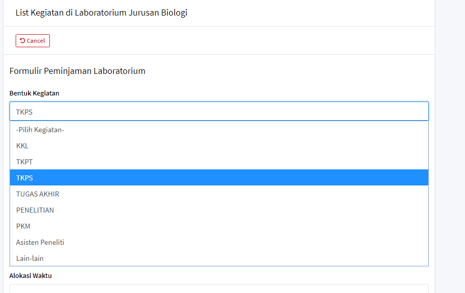 silahkan isi bentuk kegiatan kemudian isi judul kegiatan kemudian isi dosen pembimbing, pada dosen pembimbing ini data diambil dari dosen jurusan biologi, jika dosen pembimbing berasal bukan dari jurusan biologi pengguna dapat menekan tombol 'Dosen Luar' kemudian isi alokasi waktu kegiatan kemudian isi porsi kerja pada laboratorium yang akan dipinjam