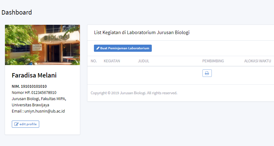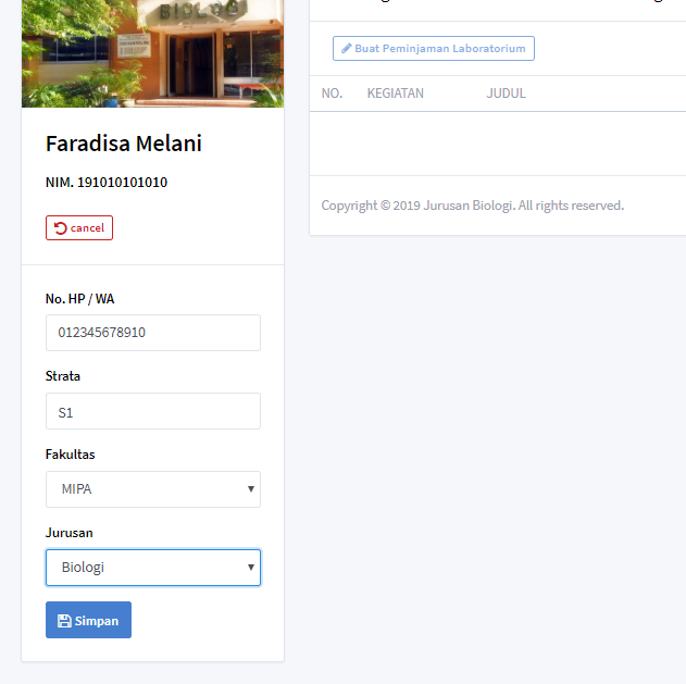 Setelah simpan profil berhasil, pengguna bisa membuat peminjaman laboratorium dengan cara klik tombol 'Buat Peminjaman Laboratorium' dan isi formulirnya