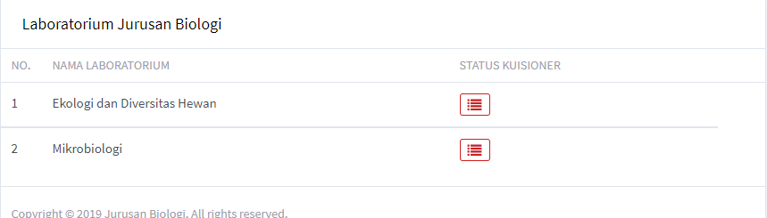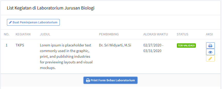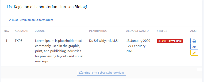 Setelah berhasil isi formulir, pengguna dapat print formulir untuk minta persetujuan (tanda tangan) Ketua Laboratorium yang akan dipinjam. Selain print, ada status yang tertulis 'BELUM TER-VALIDASI' yang artinya proses peminjaman masih berlangsung. Ketika status berubah menjadi 'TERVALIDASI', silahkan print formulir bebas laboratorium -